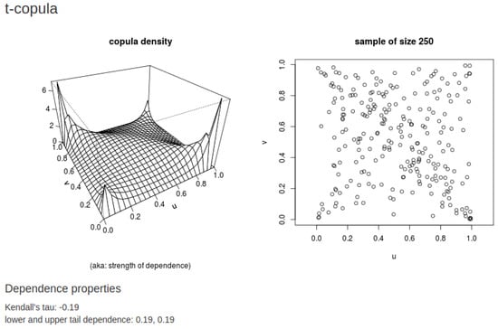 - The tail dependence coefficient (associated with a bivariate t copula as given earlier) is given bywhere is the univariate central student t distribution with degrees of freedom and is the correlation coefficient. It is important to note that a student t-copula may exhibit both the positive and negative tail dependence, although the “overall” association is negative . Furthermore, a student t-copula with a large value of tends to have a 0 tail dependence even though the correlation is 0. The t-copula can capture the asymptotic dependence even when the variables are negatively (inversely) associated (see, Embrechts et al. 2001). In the t-copula formula, as increases, the tail dependence weakens, and thus, the probability of occurrence of extreme values reduces.For illustrative purposes, we provide the following picture in Figure 15 (generated through the https://copulatheque.shinyapps.io/copulas/ (accessed on 15 June 2022) created by BenGraeler) showing a student t-copula with and , which gives the value of Kendall’s and upper- and lower-tail dependence of .