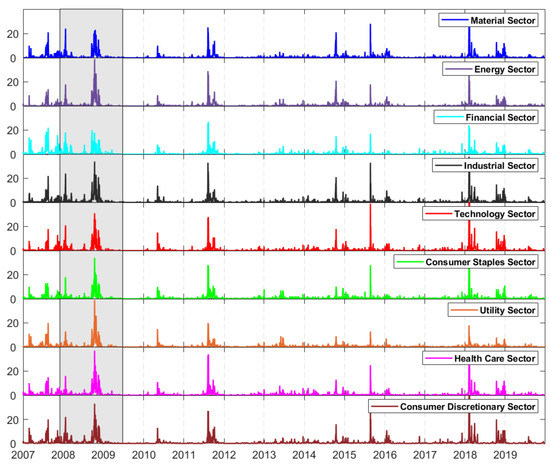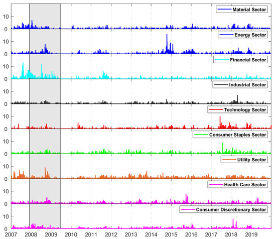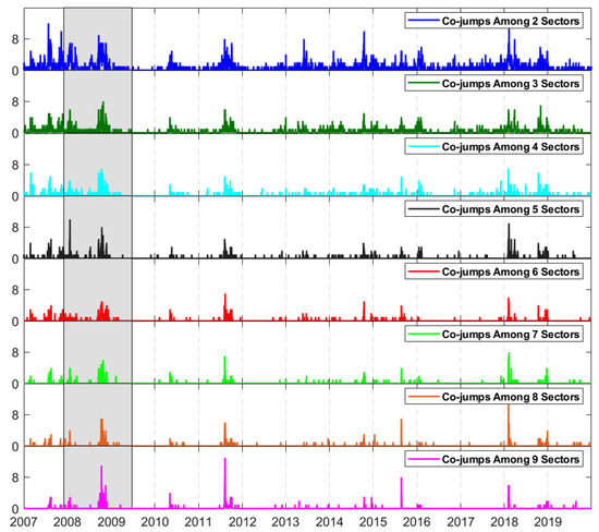 Second, co-jumps occurred more frequently than idiosyncratic jumps. Figure 1 shows the number of co-jumps under different scenarios, i.e., across a different number of sectors from January 2007 to December 2019. Not surprisingly, co-jumps detected under scenarios with fewer sectors occurred more frequently than co-jumps identified under scenarios with a larger number of sectors. Figure 2 and Figure 3 depict the numbers of co-jumps and idiosyncratic jumps, respectively. The results in Figure 2 and Figure 3 indicate that co-jumps and idiosyncratic jumps were more densely populated during significant market turmoils, including the 2008 financial crisis, the 2011 European debt crisis, the 2015–2016 stock market selloff, and the stock market dip in December 2018–January 2019. This suggested higher levels of systematic jump risk and idiosyncratic jump risk during those market downturns. Moreover, as expected, the financial sector had more idiosyncratic jumps during the 2008 financial crisis compared with other sectors, which is consistent with the fact that this crisis was mainly triggered by the collapse of the financial sector.