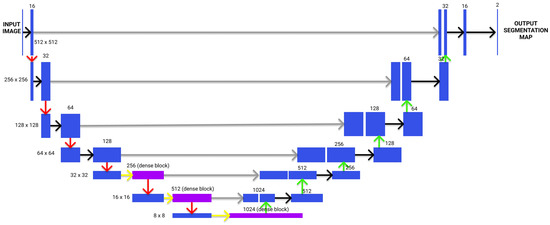In this image, different colours can be identified. Blue-coloured blocks represent regular convolutional layers. Purple blocks, on the other hand, represent dense blocks. These blocks instantiate all possible connections between neurons of two layers (with matching feature map) as Huang et al. (2016) explains. Moreover, arrows have different colours. Black arrows represent regular convolutional operations. Red arrows represent max pooling operations. Yellow arrows represent the connections of a dense layer; this means that there is one connection per couple of neurons between two connected layers. Finally, grey connections represent skip connections. The pictures report also some numbers. Those that are placed beside a block represent the dimension of the block itself in terms of width and height of the feature map. On the other hand, those that are place above a block represents the depth of the feature map.