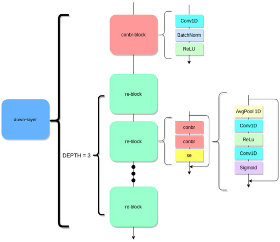 As can be seen in the figure, the down-layer is composed by two main parts. The first one is the conbr-block (which is the abbreviation of “contraction block”). Conbr-block has the aim of decreasing the number of features of the input. It is not an atomic block as well. During the development of the network we decided to group some atomic blocks for ordering the schema of the whole network: Conv1D, BatchNorm and ReLU.