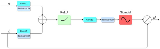 The block accepts two inputs: the upsampling output (g) and the skip connection result (). In this case, an additive attention mechanism was proposed. In the aforementioned figure, input features were scaled with the attention coefficients () computed in the AG. Spatial regions were selected by analysing both the activations and contextual information provided by the gating signal (g), which was collected from a coarser scale. A grid resampling of the attention coefficients was performed using a trilinear interpolation. According to Oktay et al. (2018), the result of an additive attention layer is given by the Formula (1).