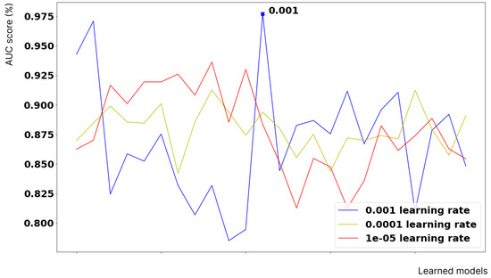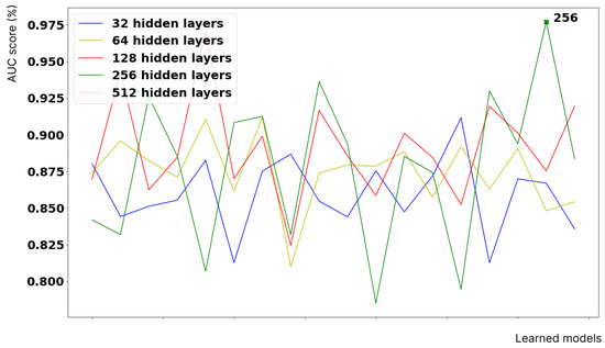 Due to the grid search, several training processes were performed. Table 2 illustrates different AUC score values (expressed in percentage) according to different hyperparameters configurations. The percentage reported in the cells represents the AUC score of the network for that specific configuration.