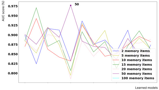 The learning rate was varied through these values . This set was chosen because during various attempts it was found that the network performed better under a relatively low learning rate. The number of hidden layers varied as . This set was made up of elements which were power of 2 (the reason for this lies in the architecture and its convolutional filters). In addition, this set spread from relatively low values to very high values trying to overfit (or better, trying to get closer to the overfitting boundary of) the model. The third hyperparameter concerned the number of memory items which fell in the set . This set embraced several orders of magnitude of number of memory items. At the end of the grid search, it should be clear which order of magnitude should be chosen to obtain the best performance of the network. In this regard, the range of values of memory items was augmented after the first phase of the grid search. In fact, a second tuning using this approach was executed in a range of memory items which was much finer than in the first run.