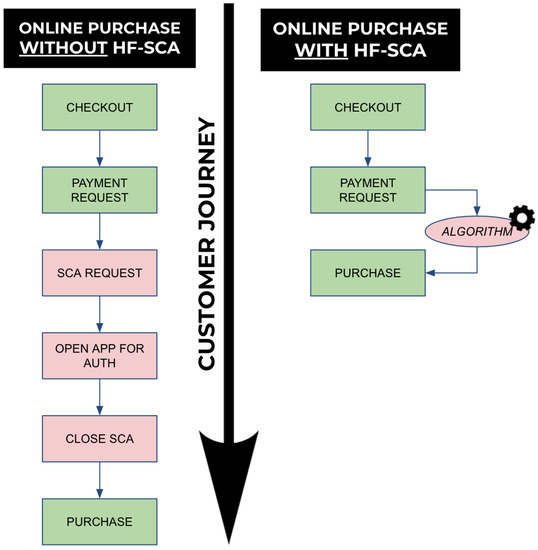 With regards to the first benefit, in Figure 13 we show a comparison of the customer journey between an online purchase using classical SCA to authorise payments and the refactored version using the HF-SCA algorithm to seamlessly authorise payments. The schema shows what we expect in terms of improvement of the customer’s payment journey. Being much shorter, the flow on the right side is much less error-prone, both from the customer side—who enjoys the SCA exemption for regular purchases—and the system side—because of technical errors that can arise during the SCA process.