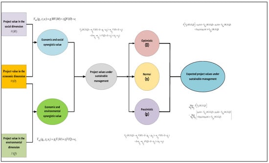 is the reaction coefficient reflecting the project value in the social dimension and the economic and social synergy value , and , and are respectively the reaction coefficients reflecting the project value in the social dimension and the economic and social synergy value under optimistic (o), normal (n), and pessimistic (p) circumstances. is the reaction coefficient reflecting the project value in the environmental dimension and the economic and environmental synergy value , and , and are respectively the reaction coefficients reflecting the project value in the environmental dimension and the economic and environmental synergy value under optimistic (o), normal (n), and pessimistic (p) circumstances. The definitions of parameters are shown in Table 3.