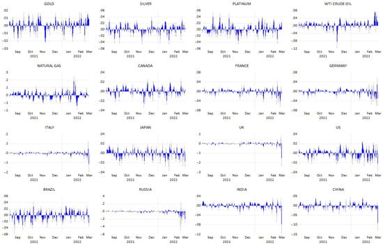 Further, from Figure 1, clear spikes are detected at the end of February and March during the invasion time. Here, all the commodities are presenting positive peaks, while gold, platinum, and crude oil have experienced a greater intensity of volatility (Dodd et al. 2022; Costola and Lorusso 2022). Conversely, all the markets exhibit a downfall, i.e., negative volatility has greater impacts than positive shocks supported by many past studies (Dimitriou et al. 2013; Boungou and Yatié 2022; Boubaker et al. 2022).