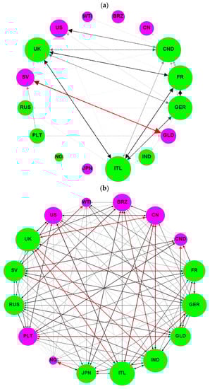 Figure 2. Network connectedness spillovers between the five commodities, G7, and BRIC markets. Additionally, within the network, the size of the node indicates the magnitude of the contribution of every index to the connectivity of the system, while the colour indicates the origin of the connectivity. The size of the node indicates the level of overflow, and the colour determines whether the market is a net sender (green) or a recipient (pink) of spillover. The finite directional layout algorithm determines the position of the vertices, with the number of vectors determining the route of the vertices. The width of the arrow indicates the strength of the multiple gradients, and the colour determines the direction of the gradient from the strongest (red) to the weakest (black). Note: The outcomes are constructed on a first-order TVP-VAR model with a first-order delay length and a 20-level generalized forecast error variance within the estimates. (a) Pre-Russian invasion of Ukraine. (b) During Russian invasion of Ukraine.