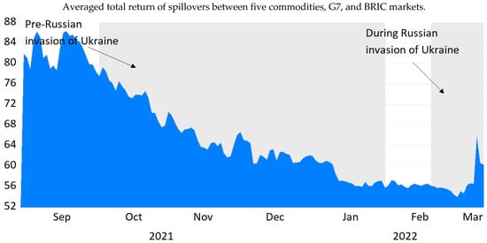 To clarify the effect of ongoing GPC, we have also presented the total time-varying (averaged total returns) spillovers between the five commodities and all the sample countries. In Figure 3, it is shown that before the start of war, the spread of COVID-19 was settling down. The spillover effect was decreasing from its peak level of 86% during the second wave of COVID-19 in the month of September 2021 to around 57% in the month of January 2022. However, this spillover augmented in February due to the sudden start of border tensions between the two companion counterparts. After this, a strong spike in spillover effect was observed that crossed the level of 65%. However, this increasing level stopped and settled at 60%, as the war force was limited and peace talks between the two countries were opened. This again supports the findings of (Adams et al. 2015), which suggest that return spillover collectively increased among all the commodities and markets during war crises (Boungou and Yatié 2022; Chatziantoniou et al. 2022; Umar et al. 2022b). In the process of such uncertain events, even limited diversification opportunities were available due to a high degree of spillovers among all markets and commodities (Wen et al. 2020a; Jiang et al. 2020; Naeem et al. 2022).