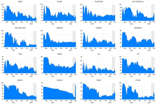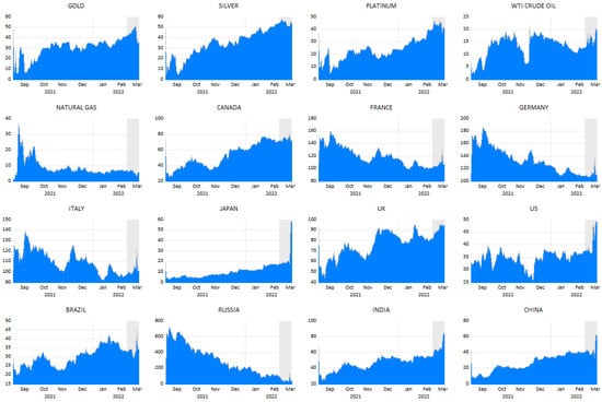 From Figure 5, quite a different image is observed, as WTI crude oil is a prominent recipient of return spillover because EU countries are consuming almost 40% crude oil from Russia (Schiffling and Valantasis Kanellos 2022). Next, platinum, gold, silver, and natural gas (less intensity) are also receiving return spillover from other commodities and markets, but gold and natural gas are experiencing comparatively less spillover effects. In the case of capital markets, other than Canada, all other markets show huge spikes of return spillover from other commodities and markets. Importantly, all European countries were experiencing (receiving) spillover effects not only before the war but also during the war, as they have strong trade ties with both warring countries (Jiang et al. 2020; Berninger et al. 2022; Adekoya et al. 2022). Regarding the BRIC countries, Russia, China, and India are the key players in return spillovers from the commodities and capital markets.
