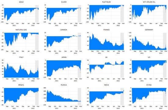 Additionally, it is observed from Figure 6 that all the commodities are net recipients of return spillovers throughout the sample period, but the quantum is less in the case of natural gas. Crude oil and gold are the most impacted commodities from this invasion crisis, and it is supported by the outcomes from past studies (Billah et al. 2021; Chatziantoniou et al. 2022). Contrariwise, except for the US, China, Japan, and Brazil, all the remaining countries are net transmitters of return spillovers; here, France, Germany, the UK, Italy, and India show rocket spikes. Similar findings were proven by (Adams et al. 2015; Boungou and Yatié 2022; Yousaf et al. 2022; Chatziantoniou et al. 2022) during the war and pandemic crisis situations. All markets are either net recipients or transmitters post-wartime, but India is the only country that was initially a net transmitter and at the end of March, it turned into a net recipient market. This is because the Indian market recovered from the shock nearly to its pre-war level. It is evidently important for the investors, hedgers, and diversifiers from the world to capitalize on this finding on the line of (Mirzaei et al. 2021; Bedowska-Sojka et al. 2022; Mohamad 2022) for international investment diversification.