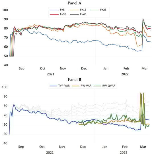 Figure 7 explains two various sensitivity analyses. Panel A shows the variations in the dynamic total connectedness by readjusting the forecast horizon. We observed that after January 2022, the variations in the measurement enhanced significantly. This could be discussed because the network was more consistent during the Russia–Ukraine war, which showed a boost in its efficiency. Additionally, the variations in the dynamics appeared to smooth out until the completion of the period, which might lead to the switch of the sample markets back to standard time.