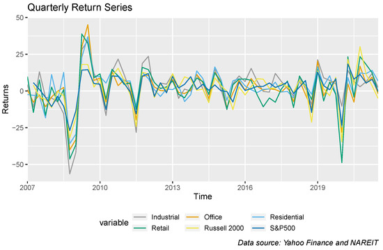 To show how the returns of different types of REITs and main market indices are correlated, we estimate the correlation coefficients among the quarterly total returns for the office, retail, industrial, and residential REIT indices from NAREIT, as well as the quarterly returns of the S&P 500 and Russell 2000 indices from Yahoo Finance. As shown in Table 1, the correlation coefficient between retail and office REITs is high at 0.9070. Similarly, the correlation coefficient between retail and residential REITs is also high at 0.8923. The correlation between retail and industrial REITs is slightly lower at 0.8043. Similarly, the correlation coefficient between industrial and residential REITs is also slightly lower at 0.7788. In Table 1, we use the S&P 500 index for large-cap stocks in the U.S. and use the Russell 2000 for small-cap to mid-cap stocks in the U.S. As shown in Table 1, office, retail, and industrial REITs are highly correlated with these market indices while residential REITs are moderately correlated with these indices. This is consistent with the existing literature in that macroeconomic variables have predictive power for REIT returns (Clayton and MacKinnon 2003).