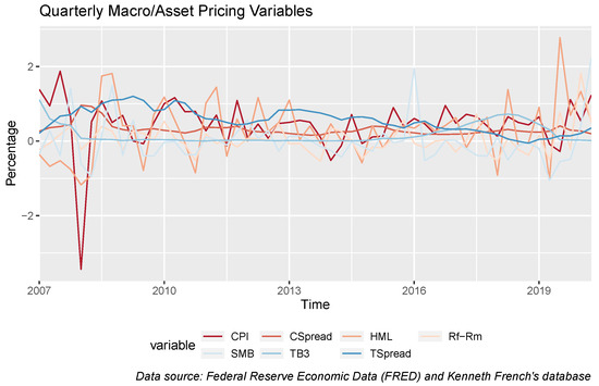 Table 2 reports that term spread (TSpread) has a moderate negative correlation (−0.5878) with the 3-month Treasury bill rate (TB3). Term spread (TSpread) has a negative but low correlation (−0.1170) with inflation (CPI) but credit spread (CSpread) has a positive but low correlation (0.2568) with term spread (TSpread). Term spread (TSpread) has very low correlations (0.0205, 0.1052, −0.0288) with, respectively, the market portfolio’s excess return (Rm-Rf), the size factor (SMB), and the value factor (HML). Credit spread (CSpread) has low correlations (0.0474, −0.1606, −0.1358) with, respectively, the three stock market factors (Rm-Rf, SMB, and HML) as well. The 3-month Treasury bill rate (TB3) has low negative correlations with all the macro/asset-pricing variables except inflation (CPI). Inflation (CPI) has low negative correlations with the bond market factors (TSpread and CSpread) but has low positive correlations with the stock market factors (Rm-Rf, SMB, and HML). The low correlation (0.1747) between HML and SMB indicates that the value and size factors are orthogonal dimensions of asset pricing. Figure 2 reports the dynamics of these variables. More specifically, the value factor (HML) and the size factor (SMB) declined substantially in 2020. However, the value factor (HML) rebounded quickly and achieved a record-breaking high while the size factor (SMB) climbed back gradually over time. Inflation (CPI) dived hard into the negative territory and reached −3.43% in 2008 while a minor dip was witnessed in 2020. Credit spread (CSpred) rose substantially during the GFC to compensate for the greater uncertainty. Credit spread (CSpread) rose a little during the COVID-19 pandemic.23