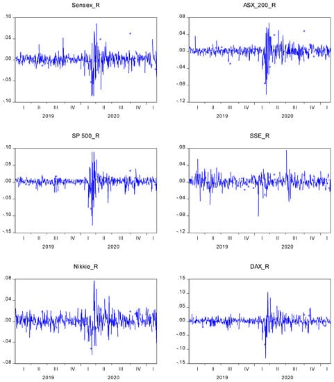 As a result of widespread COVID-19, stock market returns in all economies show significant volatility towards the end of the first quarter of 2020. Many economies throughout the world imposed a rigorous lockdown, restricted people’s movement, and halted all economic activities. The quick and unexpected spread of the coronavirus had a significant negative impact on the financial markets, particularly the stock market. Figure 1 shows that volatility increased in all stock market returns since the COVID-19 outbreak in the first quarter of 2020, i.e., since the outbreak compared to prior period (2019). The time series plot of stock market returns exhibits continuous mean reversion and volatility clustering.