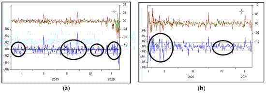 Residual time plot of OLS regression. (a) Pre-COVID 19 residual plot; (b) Post-COVID 19 residual plot.
