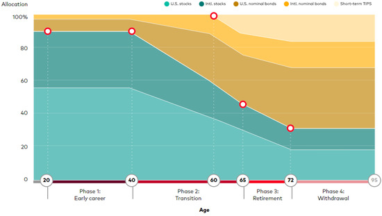 Example of Glide Path for a Target Date Fund. Source: Vanguard® (https://institutional.vanguard.com/investment/solutions/target-date-funds accessed on 25 August 2021).