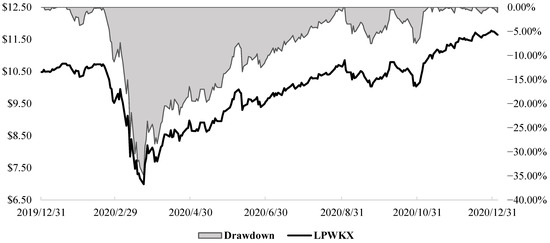 where is the fund’s maximum drawdown over the respective period of time T for sample period j, is the fund’s price at time t (0 ≤ t ≤ T), and is the highest price the fund recorded over a period of time up to time t. We calculate this maximum drawdown for each fund four times. The first drawdown calculated is for the entire year. The second drawdown value for the first sub-sample period is identified as “Period A” and reflects the beginning of the 2020 year up to 2 March 2020 (the first Federal Reserve intervention). The third drawdown value is determined for the second sub-sample period referred to as “Period B,” which is the period following the first intervention and prior to the second intervention, resulting in a sub-sample period of 3 March through 15 March 2020. The fourth and final drawdown measure is calculated for the third sub-sample period, categorized as “Period C,” which is the period following the second intervention (16 March 2020). Figure 3 provides a visual example of the price and drawdown calculation for BlackRock LifePath® Dynamic 2065 Fund Class K Shares (LPWKX), a fund in the sample, over the entire sample period. The left-axis reflects the price for BlackRock LifePath® Dynamic 2065 Fund Class K Shares (Ticker: LPWKX) and formatted per share. The drawdown amount of LPWKX is reflected via the right-axis and in percentage form.