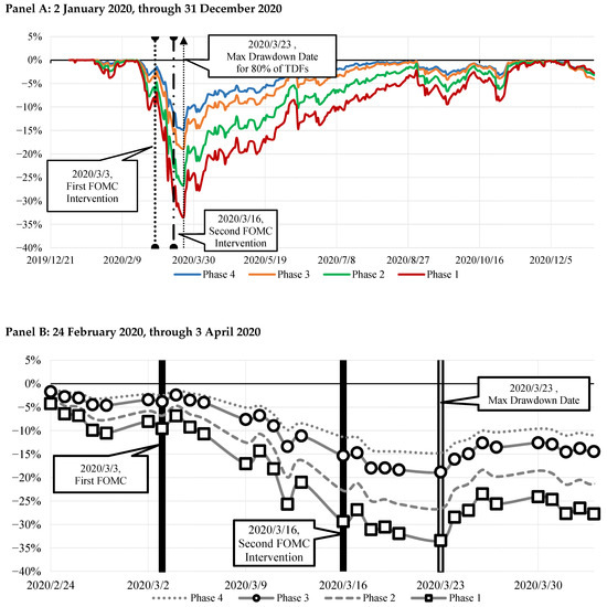 We contribute to the growing literature on defined contribution accounts and TDFs (e.g., Sandhya 2011; Elton et al. 2015; Tang and Lin 2015; Balduzzi and Reuter 2019). This research is closely related to the two recent articles by Shoven and Walton (2021) and Mao and Wong (2022). Shoven and Walton (2021) provide a thorough analysis of the evolution of TDFs from 2010 through 2020. They conduct style analyses and differences in Sharpe ratios. Shoven and Walton also examine TDFs during the specific period of 19 February through 23 March 2020. They find that near-dated TDFs experienced losses in values between 20% and 25% relative to further-dated TDFs that lost between 30% and 35% during this window. Mao and Wong (2022) investigate why TDFs performed better during the COVID-19 selloff of 2020 compared to the Financial Crisis selloff of 2008. They find a reduction in the level and cross-sectional dispersion during the most recent COVID-19 selloff. They cite this reason for the better performance along with fund managers catering to investor demand for lower risk exposure following the financial crisis. Mao and Wang estimate returns for 2020 TDFs of approximately −10.31%. This estimate is significantly different from the results of Shoven and Walton (2021). We extend both works as they do not investigate and determine the dates of the max drawdowns for the TDFs. These two articles also do not consider the impacts of the Federal Reserve interventions occurring on 2 March and 16 March 2020. We aim to contribute to the literature by better understanding how TDFs reacted before interventions after the interventions and whether the impact was homogenous across target dates. Finally, our paper contributes to the line of literature that focuses on defined contribution (DC) plans and investment options (e.g., Madrian and Shea 2001; Agnew et al. 2003; Elton et al. 2006; Pool et al. 2016). TDFs are often the default investment choice for defined contribution plan participants (Mitchell and Utkus 2021).