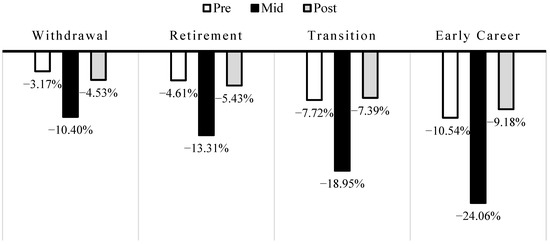 Continuing to investigate the maximum drawdown by fund category, we graph the 2020 drawdown value by portfolio classification via daily observations in Figure 5. Panel A of Figure 5 looks at the maximum drawdown values for each of the four portfolio classifications throughout the year. Identified are the two FOMC interventions and when most funds reached the maximum drawdown. The “Withdrawal” and “Retirement” portfolios recovered from their drawdowns around September 2020. The “Transition” and “Early Career” portfolios did not fully recover until December 2020. Panel B of Figure 5 enhances the graph of Panel A by focusing on the period from 24 February 2020, through 3 April 2020. This enhancement allows a better visual investigation of how the different TDF portfolio categories reacted to Federal Reserve intervention.