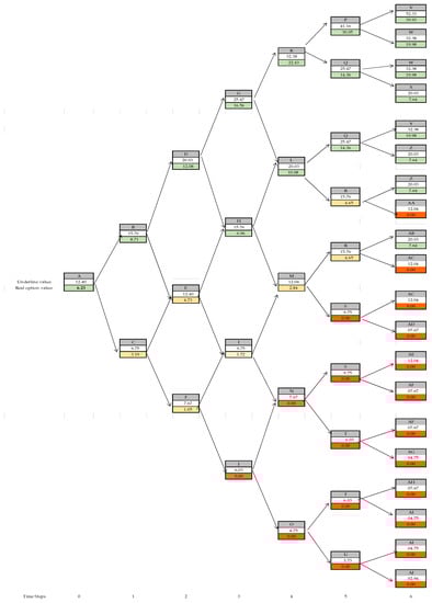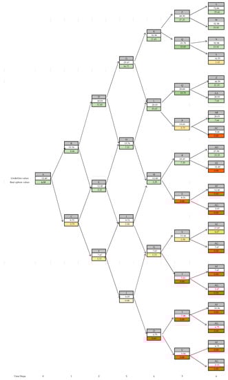 Having constructed a binomial tree, one-year time intervals for six years have been used to account for the changes in the up and down factors after the first four years. After the first four years (the period 2012–2016), the volatility increased, and the up and down factors changed as well. Therefore, for the next two years (the period 2017–2018), the joint firms’ market values are calculated using u’ and d’, and the binominal tree will no longer be recombining starting in the fifth year as shown in Figure 3 where the top values at each node represent the joint firms’ market value.