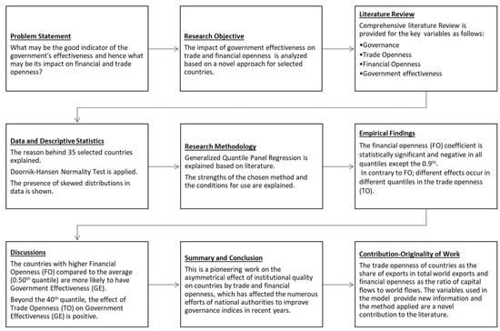Overall, existing empirical work has demonstrated the importance of trade and financial openness in economic growth, while on the other hand, the importance of government effectiveness on economic growth has also been demonstrated. However, how these variables (trade openness, financial openness, and government effectiveness) interact together as critical variables for growth has not been investigated. So, we argue that if government effectiveness and openness (trade and financial) lead to economic growth within a globally integrated economic system, then there must be a direct or indirect association between these variables. This association is investigated in this study using a sample of 35 developed and developing economies using the generalized quantile panel regression approach. To the best of our knowledge, studies have yet to investigate the collective impact of trade and financial openness on government effectiveness. As such, this study aims to address that lacuna, particularly given that government effectiveness, trade, and financial openness are all critical for economic growth (see Figure 3).