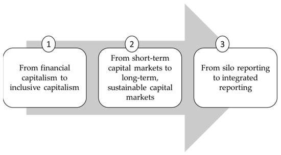 In the King IV Code corporate governance approach, three basic areas of a “paradigm shift” (Figure 2) are revealed with an innovative perspective. These are the shifts (1) from financial capitalism to inclusive capitalism; (2) from short-term capital markets to long-term, sustainable capital markets; and (3) from silo reporting to integrated reporting. In general, the Code emphasizes sustainability to improve the quality of the information provided to the public through capital flows and financial reporting standards, beyond increasing the effectiveness of corporate governance.