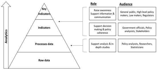 On the other hand, the trade openness (TO) variables show different structure for the observed countries. The TO coefficients in quantiles above the 0.40th all show statistically significant and positive results. This is in line with the expectations. The quantiles below average and specifically between the 0.10th and 0.20th are statistically significant and negative. Therefore, the strengthening of government effectiveness should be seen by the policymakers as a primary strategy to support the international trade integration process, focused not only on the entering of new markets through trade agreements but also on measures that enhance the legal, social, economic, and political environment to collaborate and gain more in the future. In this regard, this approach can be considered as a tool that can improve the decision-making process of governments by relying on key indicators and quality analytics. This is shown in connection to the “information pyramid” in Figure 2 below. The applications that define the data-generating process seen in Figure 2 and accordingly change the beneficiaries lead us to define the bureaucratic structure analytically. The bureaucratic structure that emerges due to data-generating processes turns into an analytical bureaucratic structure as seen in Figure 3.