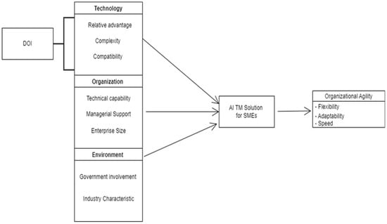 The DOI hypothesis is an innovative framework applied to support studies that aim to elucidate the elements that contribute to the spread of innovation(s) through the application of technology (). (DOI) theory examines the possibility of an organisation adopting a new technology based on its relative advantages because it is new, as well as its observations of complexity, compatibility, and amount of time spent trialling and observing it (). DOI theory can be used in a substantial way and is relatively effective when it comes to accurately predicting the adoption of a variety of different systems already in place. Research designs for studies that make use of the DOI theory can either be quantitative or a mixed methods approach. Previous research does not provide a theoretical model for the incorporation of AI into TM, which is an example of technological innovation. It is necessary to investigate AI for TM from the three aforementioned viewpoints of the TOE framework in Figure 1.