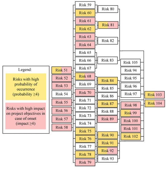 The construction of cause-and-effect relationships between compliance risks was carried out based on answering the question “What if… ?”. As an example, consider the process of answering the question, “What happens if the requirements change during the implementation of the project?”. The answers were “The contractor (performer) will not fulfill its obligations under the contract” and “The work performed (service rendered) will not meet the customer’s expectations”. Thus, between the risks of changing requirements during the course of the work (Risk 20), the risk that the contractor will not fulfill its obligations under the contract (Risk 29), and the risk that the work performed will not meet the expectations of the customer (Risk 30), causal relationships have been established.