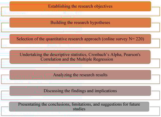 The questionnaire was developed, based on the conceptual framework (Figure 1). The questionnaire contained two sections. The first section of the questionnaire focused on the demographic features of the purchasers’ profile, including consumer online purchasing frequency. The second section of the study examined the factors affecting the purchasers’ online shopping behaviors during the COVID-19 pandemic in Saudi Arabia. The research items in section two were adopted from (). The questionnaire was developed in the form of a five point Likert scale (1 = strongly disagree to 5 = strongly agree). Using Google Docs, the respondents were asked to state their level of agreement with each item. This was a part of the overall research process, which is presented in Figure 2.