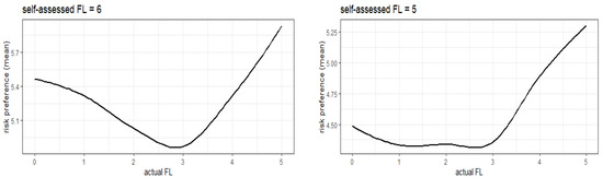 Plots of mean risk preference against actual financial literacy at given self-assessed literacy.