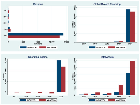 The pandemic has significantly changed the economy several countries and the financial and derivatives market. The analysis focused on two start-up companies that have played a leading role in vaccine development. The two biotech firms, BioNTech and Moderna, showed substantial increases in their shares prices during the COVID-19 period. The analysis took the form of observing the behavior assumed by companies before and after the outbreak of the pandemic. If it is undeniable that during the pandemic, the biotech sector—in general—and vaccine development companies—in particular—increased their profits and share values sharply; however it cannot be said that this was only the effect of speculation on the sale price. In fact, before the COVID-19 period, the revenue values were modest, while in 2020 and especially in 2021, they showed high growth. For the operative income, until 2020, the values were negative, though in 2021, they exceeded USD 10,000 million. The considerable funding that companies in the sector have benefited from has been the basis for a rapid restart in economic activity: the biopharmaceutical companies that developed the vaccine have had a positive effect on the market, avoiding the downturn derived from the lockdown and the activity stoppage in most economic sectors, as the GARCH model confirmed.
