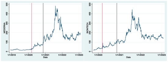 Prices of Moderna and BioNTech at Nasdaq. In each figure, the red line corresponds to 11 March 2020, which is when the WHO announced COVID-19 as a pandemic. Instead, the gray corresponds to the announcement of the vaccines’ effectiveness: 16 November 2020 for Moderna and 7 November 2020 for BioNTech. Source: Datastream.