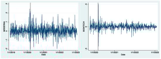 The database used in the analysis comprises the daily returns of Moderna, BioNTech, Nasdaq, Brent futures, and variations of Vix. We analyzed the Nasdaq variable, one of the reference indices of innovation, given that the reference companies have developed vaccines with a high technological content. We chose the CBOE Volatility Index because it is one of the most widely used methods of measuring volatility that indicates the frequency and magnitude of price movements over time. The Vix was used as an indicator of US market uncertainty: the faster and more substantial price changes, the greater the volatility. In fact, in mid-March 2020, market volatility reached significantly high values all over the world, given the close connection between the markets. Brent futures were used as a proxy of the economic trend. According to Pineiro-Chousa et al. (2022), the aim is to analyze the biopharmaceutical companies and stock market reaction. It comprises 1044 observations from 7 December 2018—the date on which Moderna was listed on the Nasdaq—to 31 January 2023. For the analysis, two samples were used: the pre-COVID-19 period (from 7 December 2018 to 10 March 2020) and the COVID-19 period (from 11 March 2020—the date on which the WHS declared COVID-19 a pandemic—to 31 January 2023). Furthermore, we conducted separate analysss for Moderna and BioNTech.