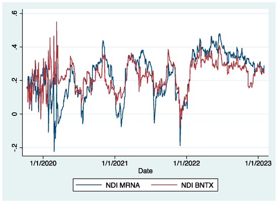 Figure 6 shows the dynamic correlations of Moderna and BioNTech with the Nasdaq Index. During the COVID-19 period, the dynamic correlation increased considerably compared with the pre-COVID-19 period, showing a clear effect between these variables. Indeed, before 11 March 2020, the correlation between the two stocks and the Nasdaq Index recorded values around zero or slightly higher, while in the immediately following period there was a marked increase in the correlation value for BioNTech and a drastic decrease for Moderna. After the initial shock, the correlation showed coordinated and cyclical swings throughout 2021 and stabilized in 2022 between 0.2 and 0.4. These results suggest that the biopharmaceutical companies that developed the vaccine could have a positive effect on the market, avoiding the downturn derived from the lockdown and the activity stoppage in most economic sectors.