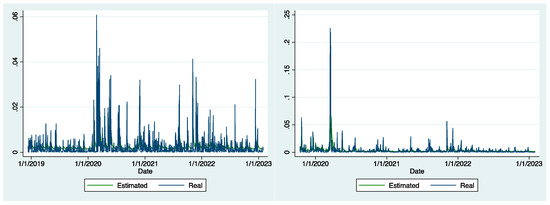 To estimate the multivariate model of the Engle procedure, residues were used. An evaluation of the GARCH model was performed by comparing the residues to the square of the diagonal matrix of variance and covariance resulting from the GARCH. After carrying out the Dynamic Conditional Correlation analysis, we estimated the matrix of variance–covariance and the matrix of conditional dynamic correlation. The analysis compares the variance estimated by the model, the diagonal elements Ht, green line, with the squares of the residues that represent the real variance, blue line. The results in Figure 7 for Moderna and BioNTech showed that the model predicted the value of the variance well for both analyzed periods.