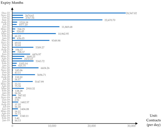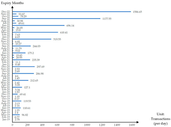 This paper uses the daily data of USD Futures, such as settlement price, last price, bid price, ask price, and trading volume, from SETSMART for a period starting from 2 January 2020 to 30 December 2022, covering the period before and after the extended trading hour (night session) of USD Futures on 27 September 2021. The Thailand Futures Exchange (TFEX) sets the settlement months (expiry months) of USD Futures to the three nearest consecutive months plus the next quarterly months. However, the most active contract month is the quarterly month. As shown in Figure 1 and Figure 2, the quarterly month contracts have the highest average daily trading volume and average daily number of transactions. In addition, since the introduction of night session trading, the average trading volume of the quarterly month contracts has exceeded 10,000 contracts per day, and its average number of transactions has been above 600 deals per day. Therefore, this paper uses daily price data from the quarterly month contracts to construct the USD Futures price data set. Following Ripple and Moosa (2009), both the daily trading volume and open interest are used as a two-criterion test to determine when to switch from the contract, which is close to expiration, to another contract in a further-out month. The USD Futures price data set is then created by switching or rolling over from the expiring quarterly month contract to the next quarterly month contract when trading volume and open interest of the expiring quarterly month contract are lower than those of the next quarterly month contract. For example, the constructed series of USD Futures price start with the March 2020 USD Futures on 2 January 2020, then switch to the next quarterly month contract, the June 2020 USD Futures, when the trading volume and open interest of the March 2020 USD Futures are lower than those of the June 2020 USD Futures. It is rolled over to the September 2020 USD Futures when the trading volume and open interest of the June 2020 USD Futures are lower than those of the September 2020 USD Futures. The process continues until the prices of USD Futures on 30 December 2022 are collected from the March 2023 USD Futures.