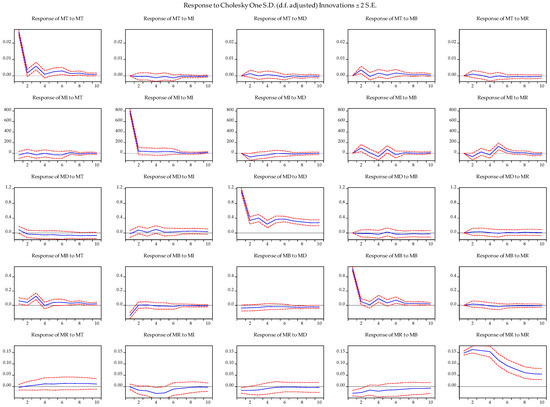 In the following, Figure 4 presents the results of the impulse response function showing the time path of each variable to a one standard deviation shock in another variable. All liquidity measures respond quickly to their own lagged changes. However, the response of MT to MT, MI to MI, and MB to MB diminishes quickly and reaches equilibrium within 10 observation days, while in the case of MD to MD and MR to MR, it takes more than 10 days. Moreover, it is evident that MD is not dependent on any of the liquidity dimensions. MB is more dependent on MT than the other liquidity dimensions are. MI is more dependent on MR than other liquidity dimensions are. MR responds negatively to MI, MD, and MB and adjusts within 10 observation days.
