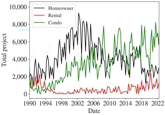 Major shifts in the market trends during the selected period (i.e., 2019 to 2023) can significantly influence the development projects, potentially countering policymakers’ attempts to address housing supply and affordability challenges (Lorga et al. 2022). According to Figure 4a, the historical trend for construction costs has rapidly increased since 2017. This increasing trend has accelerated since 2021 following the pandemic, which can be a potential reason for alterations in the projects initiated before 2021 due to their failure to foresee the drastic rises in construction costs. Similar to construction costs, the actual trend for unit sales prices has significantly increased since 2017. According to Figure 4b, the market experienced a significant increase in unit sales prices in 2019 (before project initiation). The unit sales prices have experienced significant oscillations after the project start due to market instability; however, the overall prices continued to rise, which can increase the potential revenues for the development projects. Interest rates have also seen significant changes since 2017, as shown in Figure 4c. Prime interest rates dropped from 1.75% to 0.25% in 2020. More recently, interest rates have significantly increased since March 2022 up to 6.75% in June 2023, which can cause remarkable changes in project financing costs. Understanding the potential impact of rising costs and interest rates at this time is essential for longer term housing market planning.