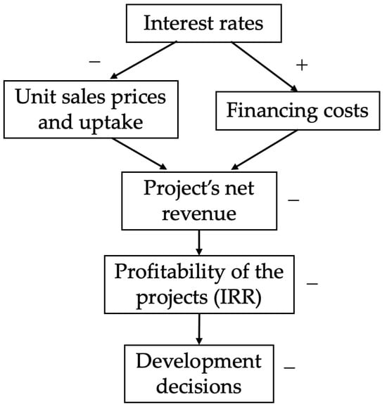 Impact of increase in interest rates on the development decisions through decreasing unit sales prices and increasing finance costs. Signs show the direction of change: a positive sign represents an increase and a negative sign denotes a decrease.