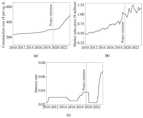 Historical market trends for (a) construction costs (Altus Group 2022; Statistics Canada 2023), (b) sales prices of properties (CMHC 2023a), and (c) loan interest rates estimated as the prime interest rate plus 2% (Bank of Canada 2023) in the Toronto land and housing markets.