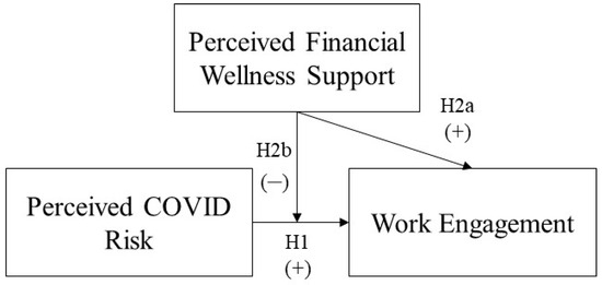 Another more likely view is that employees who enjoy strong financial wellness support would not be as worried about the economic shocks of COVID-19 because they have established financial stability. In this case, employees may feel less need to put forth discretionary effort into their jobs. This approach is consistent with the above arguments on external threats to the economy and engagement in emerging economies. Conversely, employees who do not have strong financial wellness support may worry about COVID-19 threatening their financial stability, and therefore, they are likely to put forth extra effort into their jobs, resulting in increased engagement. Figure 1 depicts this hypothesis.