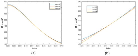 Figure 3b depicts the change in the value of for a floating strike put concerning variations in values. Similar to the previous case, a shift in from −0.6 to −0.4 results in a minor decline in the value of . Moreover, across all instances, an increase in s is associated with a rise in the value of .
