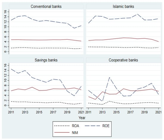 ROA, ROE, and NIM of conventional, Islamic, savings, and cooperative banks: 2011–2021.