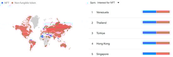 Figure 1 presents the Google Trends search volume index for the keywords “NFTs” and “non-fungible tokens” across different geographic regions. The figure shows the relative search interest for these keywords over time, from 2018 to 2023. The geographic dispersion of search interest is also illustrated, with regions of high and low interest highlighted.