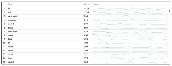 A word cloud arranges terms based on their frequency, with the most common terms centrally positioned and larger in size. The algorithm aims to place words closer to the visualization centre and may incorporate smaller words into spaces created by larger words. However, it is crucial to note that word colour and absolute positioning lack significance in this context. One should exercise caution when interpreting word clouds, as they fail to capture co-occurrences and potential variations in meaning. Figure 3 and Figure 4 depict the word cloud and the top 15-word frequencies and trends. In the word cloud presented in Figure 3, the prominent terms include nft, nfts, metaverse, blockchain, market, digital, research, touch, media, value, and data. These term preferences are substantiated by the data illustrated in Figure 4. In Figure 4, the first keywords appear at a higher frequency than the other words; thus, the fifteen words demonstrate an order of importance. The trend lines in Figure 4 show the distribution of relative frequencies across documents in our sample.