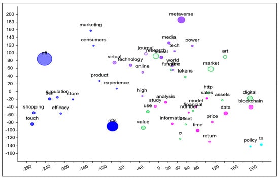 The four colours show the four different clusters, with the bubble sizes depicting the raw and relative frequencies. Similar to the word cloud analysis, the blue cluster shows NFTs, the purple cluster shows metaverse, the green cluster identifies digital, and the pink cluster shows blockchain and related keywords.