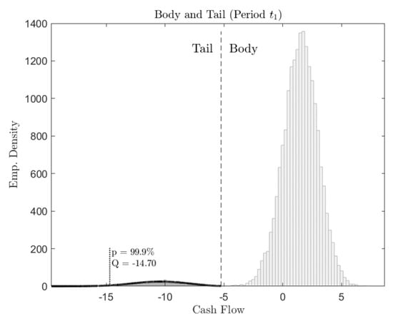 In practice, there are often examples indicating that the overall distribution of a company’s cash flow is not unimodal in many cases (Ernst 2022b) and that a superimposed distribution in the area of the loss tail can often be clearly identified; Figure 1 provides an example. This raises the question of a suitable risk assessment, e.g., in the form of calculated quantile values that can be included in a risk report or an assessment study. Quantile calculations, for example, can be based on a distribution model for the cash flow of the company under consideration. The simple adaptation of a hypothetically assumed, unimodal distribution to the overall distribution is likely to lead to poor goodness-of-fit test results because possible bimodality and regularly result in the rejection of the hypothesis; see, e.g., (Cramér 1928a, 1928b; von Mises 1928; Anderson and Darling 1952, 1954; Shorack and Wellner 2009).
