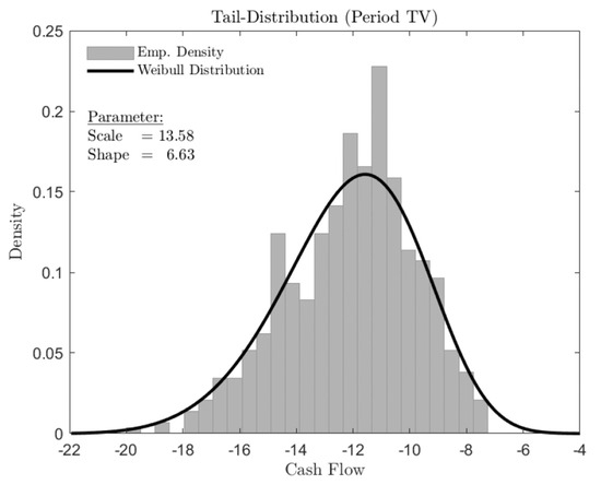 Using the example of CFtE in period TV, we show in Figure 2 the empirical distribution function of CFtE in detail in the tail area. For other planning horizons, see Appendix A. A calibration with the Risk Kit was performed to check which distribution function best approximates the empirical distribution function. A total of sixty tail distribution functions were fitted to the data, and various goodness-of-fit tests were performed with them (Wehrspohn and Zhilyakov 2011, 2021). Table 5 lists the six distributions that show the best results in full statistics with respect to the goodness-of-fit tests. The distributions listed are ranked according to their suitability. Of these, the Weibull distribution stands out for this dataset, as it shows the best fitting behavior in all tests. Thus, the Weibull distribution best represents the empirical distribution function in the tail area. For period TV, Figure 2 clearly presents the empirical density and the fitted Weibull distribution with their scale and shape parameters. The result of the calibration shows that the distribution functions that are closest to the given empirical distribution function correspond to the distribution functions that are also used in extreme value theory; see (Embrechts et al. 1997; Basel Committee on Banking Supervision 2009). Therefore, in the absence of a suitable data basis, it may be a favorable approach to model tail risks directly with the GPD and thus to use it as an approach for modeling tail risks in corporate planning.