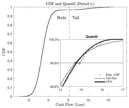 Using the method described in Appendix C, the dataset is separated into a body and a tail region, and for the tail region, the GPD (compare Appendix B) is fitted as a distribution model. The threshold is determined, and the maximum likelihood estimators and of the distribution parameters are calculated from the dataset assigned to the tail. As an example, the result of this modeling procedure is shown in Figure 3 for period t1. By changing the sign, the losses (in mio. euro) are noted as positive values. The main graph shows the empirical cumulative distribution function for the whole dataset. A plateau is clear between the loss values of approximately EUR 3 to 5 million, which delineates the two distribution parts (body and tail distribution); see also Figure 1. For a correct assessment of the risks at high quantiles, the procedure described in Appendix C models the tail of the tail distribution starting at a threshold value of = 9.83 mio. euro and estimates the distribution parameters of the GPD. The inner graph of Figure 3 focuses on the 99.9% confidence interval, which is important for regulatory purposes.